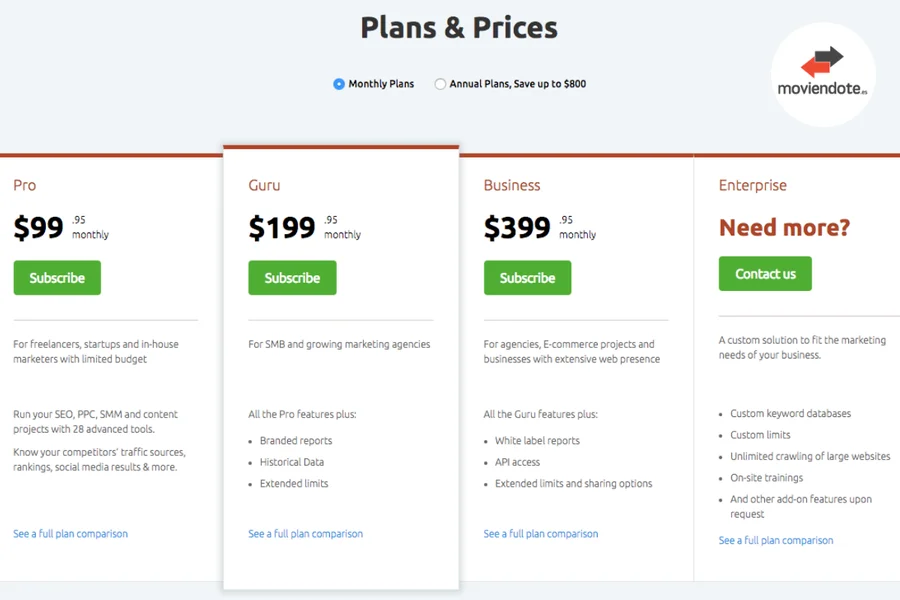 El pack Guru también te permite obtener 20 informes en PDF con marcas personalizadas y acceso a los datos históricos, más 1,500 palabras clave rastreadas, 300,000 páginas web rastreadas y 100 sitios de redes sociales.