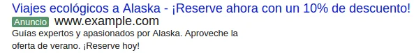 La URL visible es la dirección del sitio web que se muestra en el anuncio. En los anuncios de texto, la URL visible aparece de color verde, junto al icono “Anuncio”. A continuación mostramos un ejemplo: