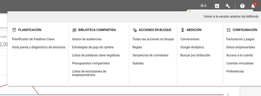 Si se tiene acceso a las dos cuentas, tanto de Adwords como de Google search console, la conexión resulta muy fácil, simplemente accediendo al icono en forma de llave en la parte superior derecha del menú de Google Adwords y se seleccionará cuentas vinculadas.