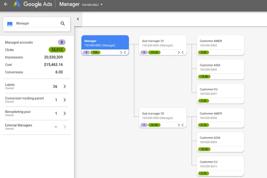 Comprenderás muy rápidamente cómo está estructurada la cuenta y consultar las métricas de rendimiento de cada subcuenta, como las impresiones, los clics o los costes.