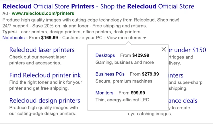 Lo anunciantes de Bing ads ya pueden usar la extensión para mostrar los precios o servicios a incluir en la descripción de hasta 25 caracteres para cada extensión. La extensión de precios es visible desde el anuncio y permite abrir una desplegable mostrando hasta tres productos o servicios de la empresa.