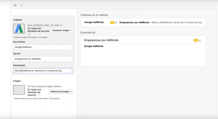 Se escribe el nombre del anunciante, este debe coincidir con el dominio o el nombre reconocido del anunciante y no puede sobrepasar los quince caracteres, después se introduce el asunto que es el tipo de anuncio minimizado, se puede incluir una oferta, un porcentaje de descuento o un anuncio atractivo, debe ser un breve resumen o una llamada a la acción llamativa y puede ocupar hasta cien caracteres. Por último se sube la imagen pero hay que tener en cuenta que debe ocupar poco, no se admiten javascript, hojas de estilo, etc… Moviendote es agencia Google Adwords, visítanos