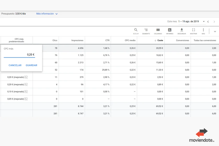 Si por ejemplo planificamos un gasto de 120 €/mes y queremos tener la campaña todos los días activa, tendremos de presupuesto 3,8€/dia.