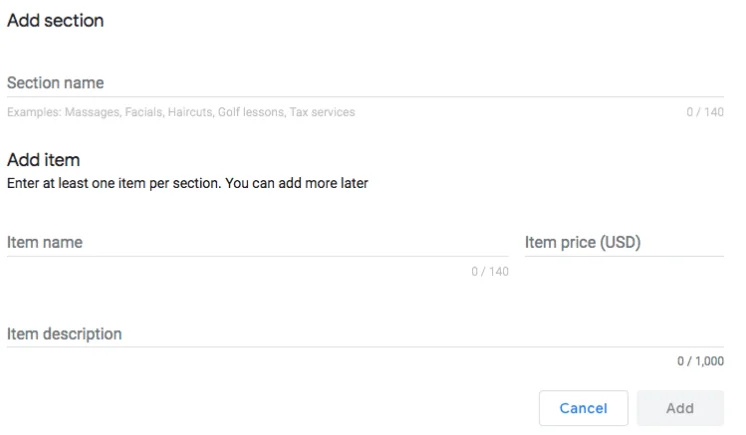 La opción de incorporar servicios con precios en el perfil de Google Mybusiness de momento solo está activa en las fichas en idioma inglés y para los negocios que no tiene conectada la ficha con servicios de terceros.