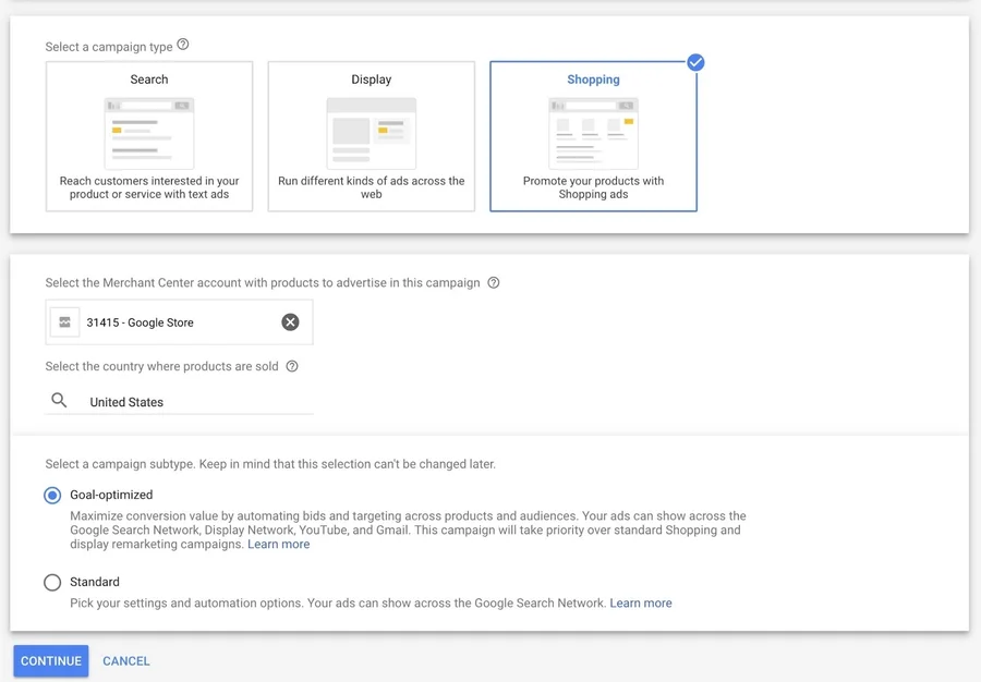 Las campañas “Goal-optimized” se encuentran en fase Beta para los anunciantes en EEUU, y se configuran al crear una nueva campaña de Shopping