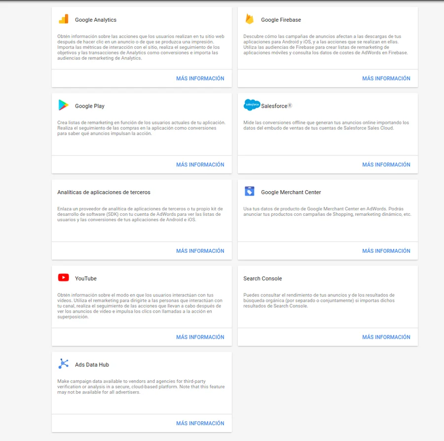 Una vez seleccionado, se seleccionará la vinculación con Google Search console, Adwords permite además conectar con muchas otras herramientas para evaluar el rendimiento de las campañas de PPC.