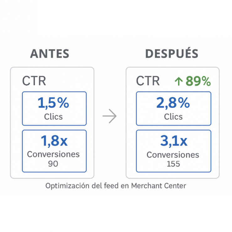 Tras ajustar títulos, precios y atributos del feed, mejoramos el CTR un 89% y el ROAS pasó de 1,8x a 3,1x.